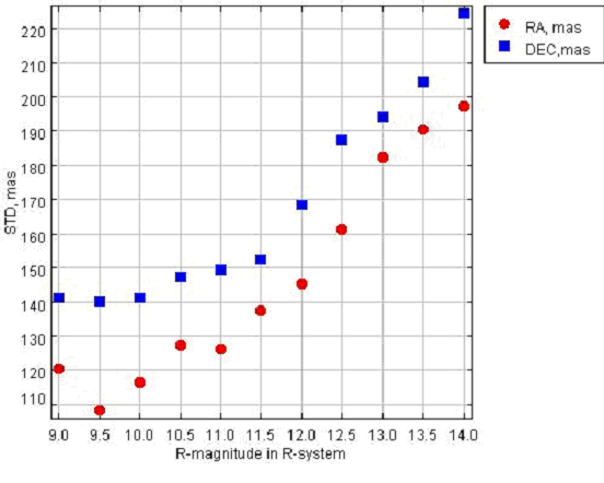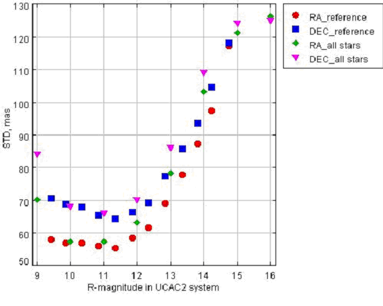 — Рис.2 Зависимость внутренней погрешности одного положения от звездной величины. Средняя точность каталожного положения звёзд в калибровочных площадках составляет 72 и 91 mas соответственно по прямому восхождению и склонению. В 2008-2009 годах программа наблюдений эклиптикальной зоны была продолжена с целью получения астрометрических параметров звёзд в протяженных астрометрических калибровочных площадках. Зона наблюдений была расширена на 53 площадки размером 7.5 х 1, которые размещены достаточно равномерно в зоне склонений ±10 о эклиптики, и площадки, в которых находятся звёзды с большими собственными движениями. По результатам наблюдений получен каталог положений и собственных движений 140189 звёзд в системе опорного каталога UCAC2. Внутренняя погрешность положений каталога составляет от 55 mas до 125 mas для звёзд 9.5 — 15 звёздной величины, систематическая разность с каталогом TYCHO2- 120 mas для положений, и 7-8 mas/year для собственных движений.