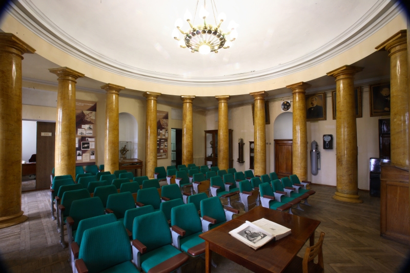 Along with the main research activities, scientific and educational work is carried out in the Research Institute Nikolaev Astronomical Observatory. Old astronomical instruments, a collection of astronomical clocks, old books, photographs, paintings and charts have been saved in order to popularize the astronomy. All the instruments are in the museum of RI NAO. Currently, the museum includes over 150 exhibits. The exhibition is located in the Round hall of Main building and in two astronomical pavilions. The collection of astronomical clocks is presented in the Round hall. It contains a number of unique high-precision mechanical clocks made in the 18-20 centuries by English, Dutch, German and local well-known artists. Mechanical astronomical clocks were used in observations nearly half a century. Much attention in the manufacture of clocks had been given to the art part: the watchcases inlaid with metal, decorated with carved metallic details and a clock pendulum. In addition to the collection of clocks there are chronometers, astronomical alarm clock and Favorzhe dial. There are "Bamberg 6353” transit instrument, a portable vertical circle by Repsold firm (D = 40mm, F = 500mm), made in 1868 to determine longitude and latitude of points on the Black Sea coast, a new collection of astronomical geodetic and navigational instruments in the Round Hall. Also there are instruments related to the period of the Naval Observatory: Negretti Zambra sextant, sundial made by Moscow ZETER firm, Lambrecht polimetr, marine compass, compass made by Brouwer's firm (St. Petersburg), the standard of Fortin meter (1830) and etc. There is a big portrait gallery of famous personalities and directors of the observatory. It is a gift from the Nikolaev artist I.O. Myalo to the 185-year anniversary of the observatory. Collection includes 12 portraits, including portraits of G.A. Potemkin, the founder of Nikolaev city, Admiral A.S. Greig, the founder of the Observatory , the first three directors of Pulkovo Observatory, etc. By the way, the author of portraits is a great-niece of I.I. Ponomarenko, the mechanic of our observatory. In show-cases of the museum there are some outstanding published works of directors and astronomers of the past and proceedings of observatory of recent years. Photo stands of the museum reflect important moments of scientific and practical activity of the observatory from its foundation till the end of the 20th century: Observations on telescopes and the constructions of pavilions, the Time service, and astronomers work in expeditions to island Shpitsbergen and to the North Caucasus. A special stand is dedicated to the axial meridian circle that earned the status of national property of Ukraine in 1999. The center of the Round hall is marked with a sign on a granite plate. A four-rayed wind-rose is represented on a granite plate, with a 575 mm diameter and 22 mm thickness. It is directed along the meridian (the longer ray) and the first vertical (the shorter ray). The two perpendicular rays correspond to the stylized profile of meridian instruments such as meridian circle and a transit instrument which were the first instruments of the Nikolaev observatory. The longitude and latitude measured and calculated by K. F. Knorre are indicated on the plate. Meridian circle and vertical circle by Repsold firm are situated in two different pavilions. They have been restored and transferred to the museum of RI NAO. Repsold Meridian Circle (D = 150mm, F = 2150mm) was ordered by Repsold company (Hamburg) in 1834, for Pulkovo Observatory by the famous astronomer V. Ja. Struve. More than a hundred years the observations were carried out on it. The instrument was badly damaged during the World War II. In 1955, it was moved to Nikolaev, and after repair and restoration, observations had begun. Nine different catalogs of star's positions had been received for more than 40 years. Repsold Vertical Circle (D = 108mm, F = 140mm) was ordered in 1897 from Repsold brothers firm in Hamburg by O.A. Backlund, the director of Pulkovo Observatory. In 1899, in Odessa department of Pulkovo Observatory the regular observations had started using this telescope. It was moved to Nikolaev in 1913. Observations on the vertical circle were carried out until 1985. Five absolute catalogs of stars declination had been received using it. |